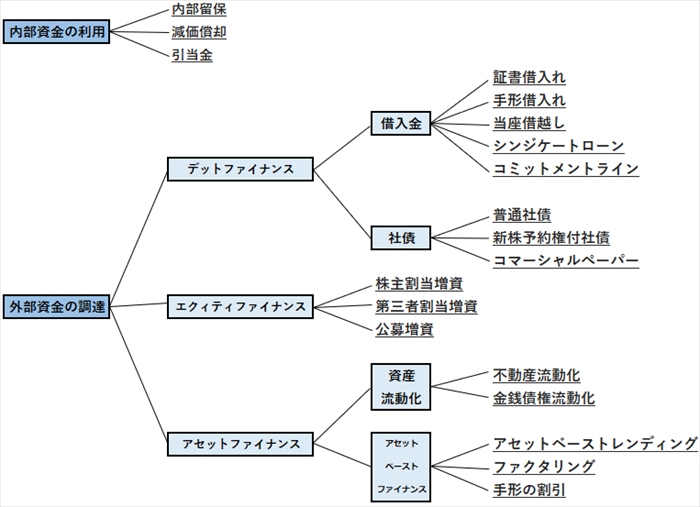 アセット・ファイナンスやデット・ファイナンス、エクイティファイナンスに分類される資金調達方法の具体例は、主に以下のようなものがあります。
