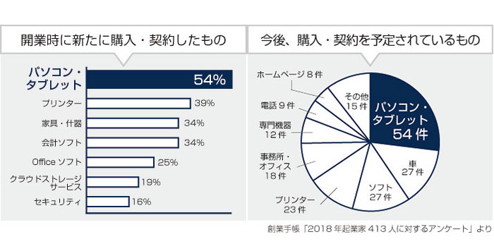 創業手帳が2018年12月に行った起業家413人へのアンケートによると、開業時に新たに購入・契約したものは断トツで「PC・タブレット(54%)」という結果でした。半数以上の起業家が、事業開始にあたって「新たに」PCやタブレットを買っているという点にも注目です。加えて今後、購入・契約を予定しているものについても、PC とタブレットが約4割を占めました。最適なPCを揃えることは、経営に不可欠と言えるでしょう。
