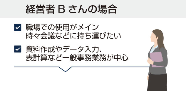 経営者Bさんは、職場でPCを使うことがメインです。会議などに持ち込んで使うこともあります。作業としては、資料作成やデータ入力、表計算など一般事務業務が中心となります。この場合、PCには