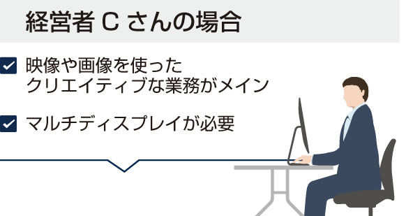 経営者のCさんは、映像や画像を使ったクリエィティブな業務をメインにPCを使っています。そのため、マルチディスプレイが必要です。この場合、