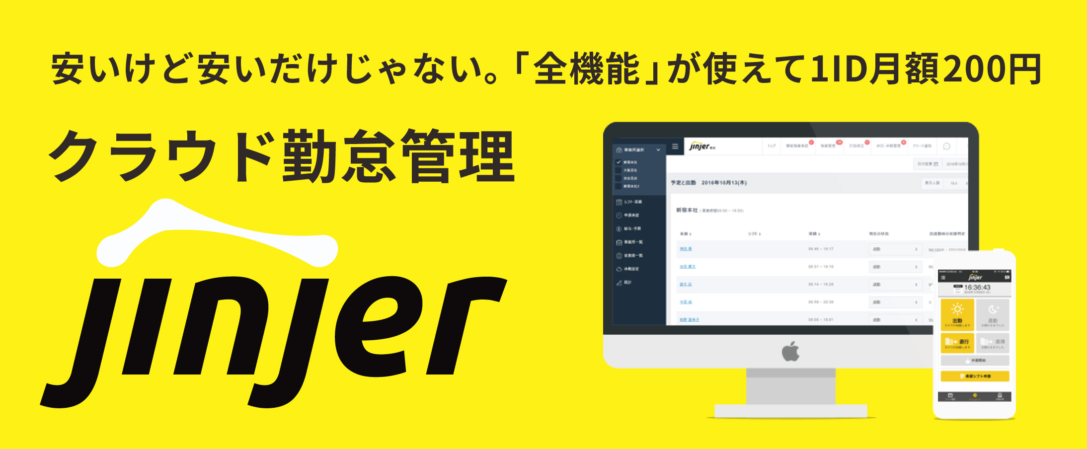 従業員を雇うことになったら、就業状況を記録して給与計算を行うための「勤怠管理システム」が欠かせません。いまだに手書きやエクセルで管理している経営者が多いですが、休日出勤・深夜労働等の各種手当や、派遣社員・アルバイトなど労働契約毎の計算など、コンプライアンスを遵守するために求められる適切な勤怠管理システムには多くの手間が必要です。勤怠管理システムjinjer(ジンジャー)は、そんな面倒な勤怠 管理を自動化することで、人事にかかる時間とコストを大幅に削減できるサービスです。