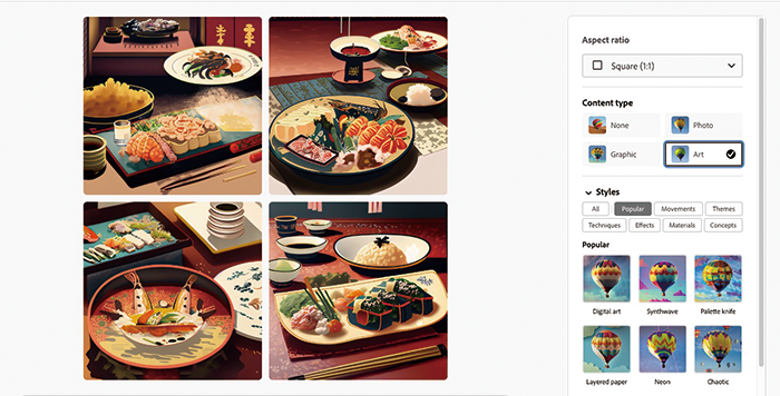 このようにAdobe Fireflyでは、瞬時にイメージの全く異なるものが複数生成できますので、クリエイティブの生成にくわえ「アイデアを膨らませる」という作業の際にも活用可能性があるでしょう。