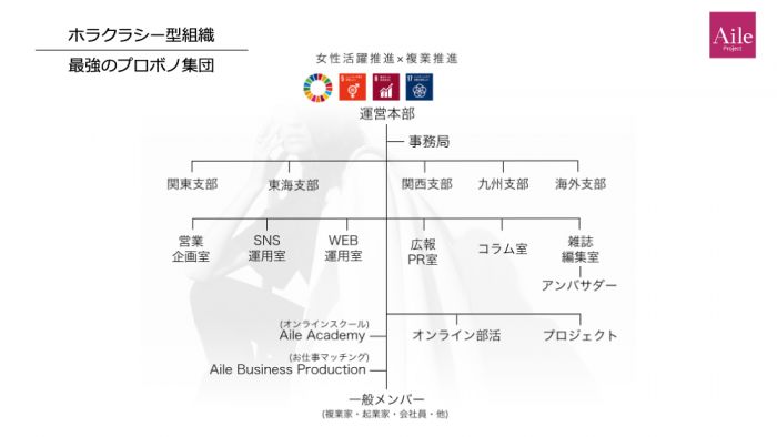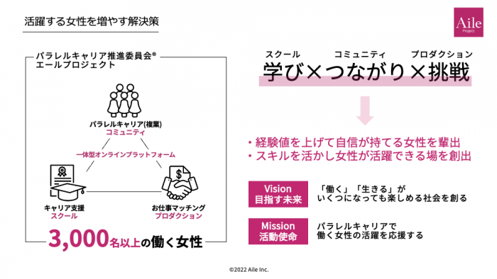現在は、エール株式会社でパラレルキャリア推進委員会®という女性の支援団体を運営しています。パラレルキャリアを始めたいという女性たちに向けたコミュニティと、複業をスタートしたいという方のためのスクール、そして活躍を創る場としてプロダクションというお仕事マッチングの一体型のオンラインプラットフォームです。