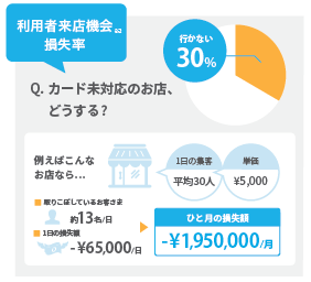 クレジットカードを保有している消費者への調査(下図)によると、10人に3人はクレジットカード決済が行えないことでお店を選びなおすと回答している。例えば1日平均30人来店するお店の場合、カード決済を導入していれば43人が来店する計算になるので、1日13名の顧客を取りこぼしていることになる。客単価5,000円のお店であればひと月でなんと195万円の損失につながるのだ。特に飲食店や美容院、エステサロンなど、Webで事前に情報を吟味し、他店と比較した上で予約することの多いお店であればさらに顕著な結果になるだろう。