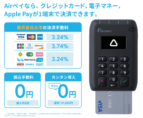 Airペイでは「VISA」「Mastercard®」「JCB」などの主要な国際カードブランドに加え、「Suica」など全国の交通系電子マネーが、iPadまたはiPhoneと端末1台で決済できる。従来であれば決済方法によって複数の端末をそれぞれ導入する必要があり、電子マネーへの対応には更なるコストがかかっていた。Airペイならカードも電子マネーも1台で対応できるうえ、今ならカードリーダーの費用(¥19,800)のキャッシュバックキャンペーンを実施している。Apple Payに対応することも発表されており、これからますます増加するであろう電子マネー決済も、文字通り「コストゼロ」で導入できる。