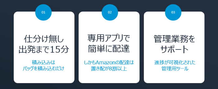 つまり、Amazonオフィシャル配送サービスパートナーには安定した商品量が供給してもらえるため「物量が不安定で収入が安定しない」「営業しなければならない」といった悩みを抱えずに済みます。