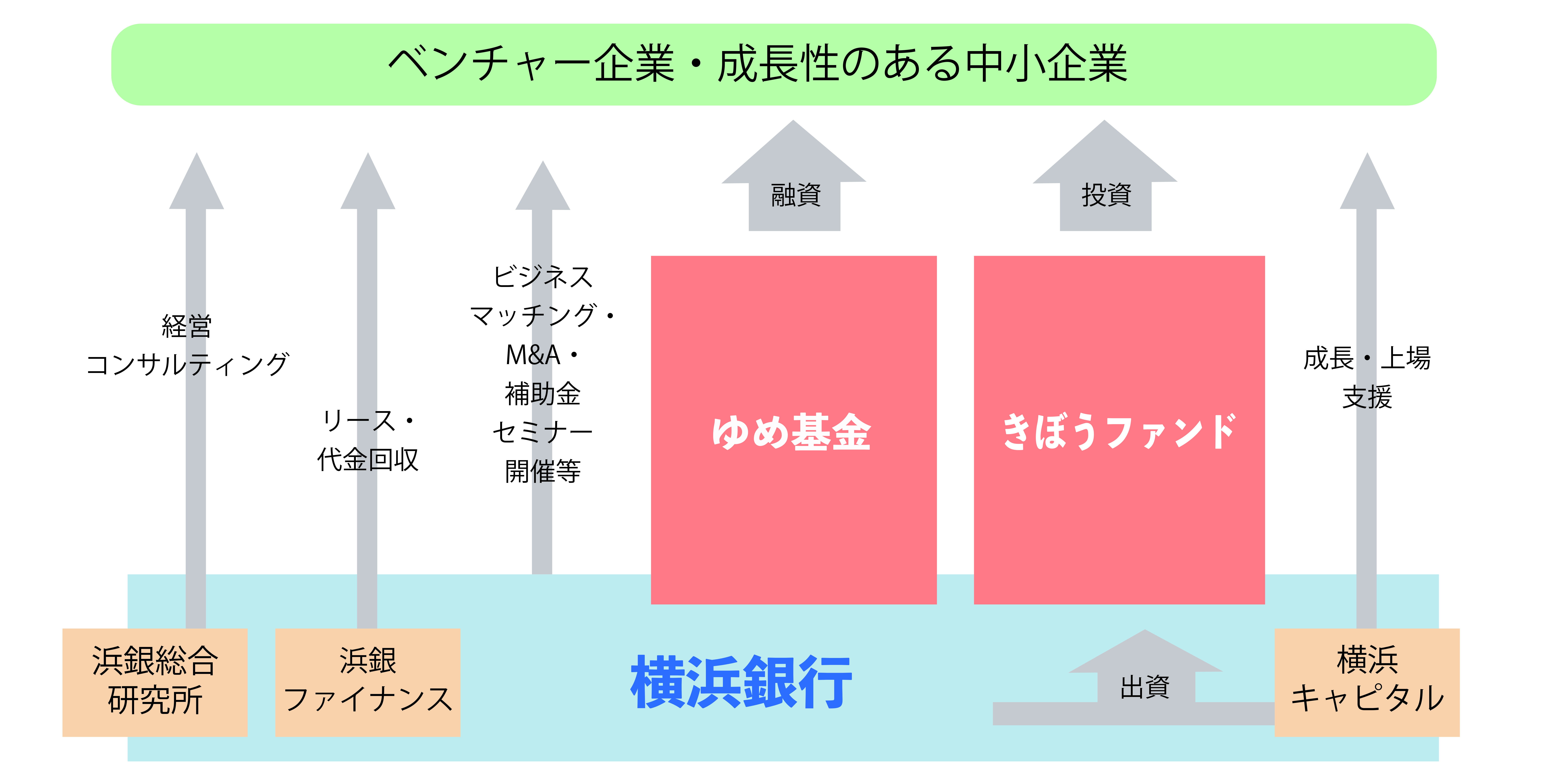 横浜銀行では、創業・ニュービジネス進出する企業を支援するために、融資・投資を中心とした様々な創業支援を設立しています。経営コンサルティングやセミナー、成長支援はもちろん、創業・ニュービジネス向け融資ファンド「ゆめ基金」や成長、創業、事業承継といった幅広い取り組みを、資本面から支援する「きぼう投資事業有限責任組合(きぼうファンド)」があります。
