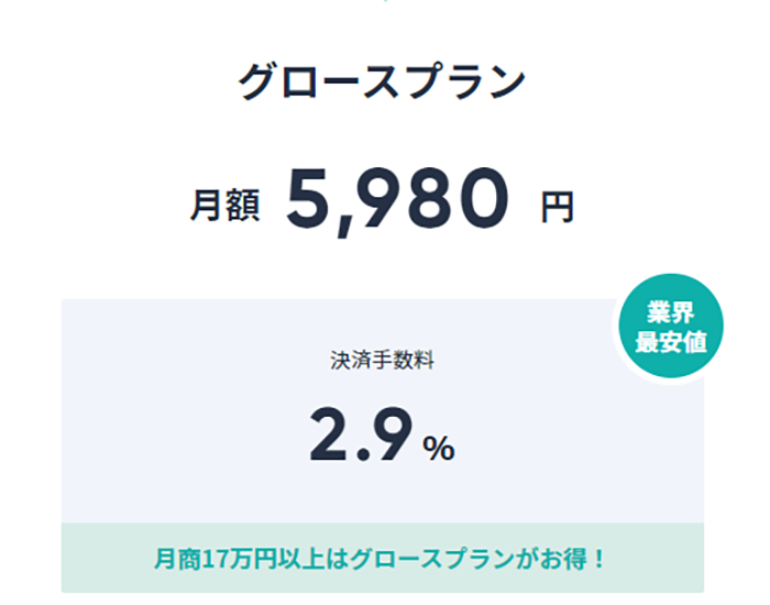 グロースプラン月額5,980円(税込)で、決済手数料が業界最安値の2.9%です。