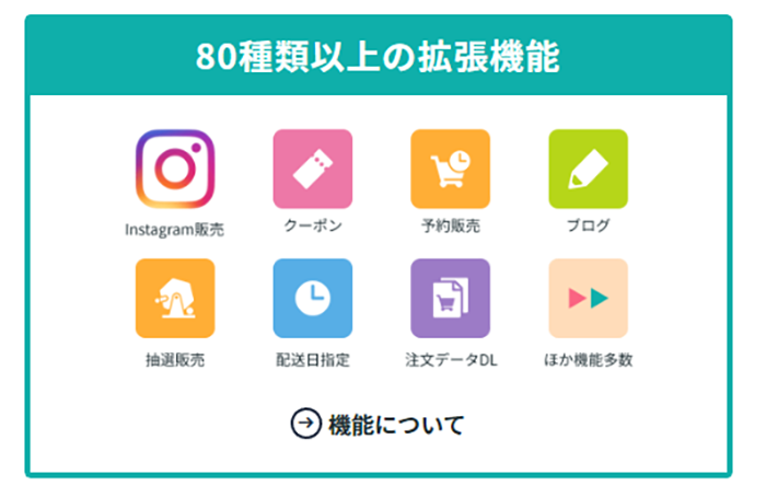 ショップの顧客に対して無制限にメールマガジンを送れる「無制限のメルマガ配信」や、人気商品を抽選で販売できる「抽選販売」、商品登録数の上限なしで一括登録が可能ですし、Instagram連携などにも対応しています。