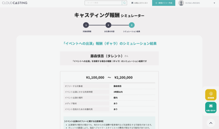そこで”依頼したい人”とその人に”どのような仕事を依頼したいか”を入力するだけで、わずか3分程度で相場のシミュレーションが可能な追加機能の開発に着手。こうした経緯で「キャスティング報酬シミュレーター」の提供を開始しました。