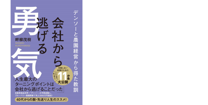 書籍「会社から逃げる勇気」は、今の働く環境や人生に満足していないにもかかわらず、転職や独立への一歩が踏み出せない人に向けて出版されました。45歳でブルーベリー農園を起業して、今では年間60日の稼働で年収2,000万円以上を得ているブルーベリーファームおかざきの畔柳茂樹さんが書いた本です。