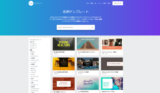 世界で1000万人以上の利用者がいる「Canva」。無料の会員登録をすることでテンプレートや写真素材から名刺を作成することができます。テンプレート通りに作成するだけではなく、画像フィルターを使用したり、無料のイラスト素材も多数あるので、オリジナリティ溢れた名刺を作成することができます。また、スマートフォンやiPadからも作成することができるので、手軽に利用することができます。