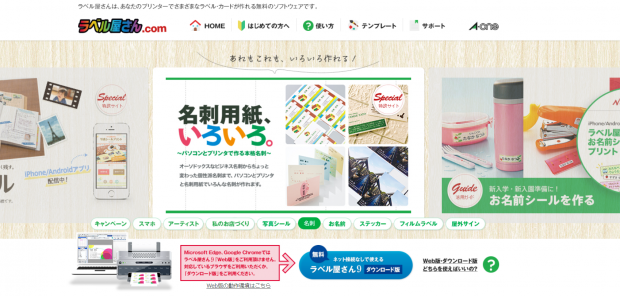 対応しているラベル・カードは600種類以上。インストールや更新が不要な「ラベル屋さん9 Web版」のテンプレートは便利です。しかし、Google Chrome、Microsoft Edge、Safali7以降のブラウザでは利用できないので、ネット接続なしでも利用できる「ラベル屋さん9 ダウンロード版」で名刺を作成してみてください。