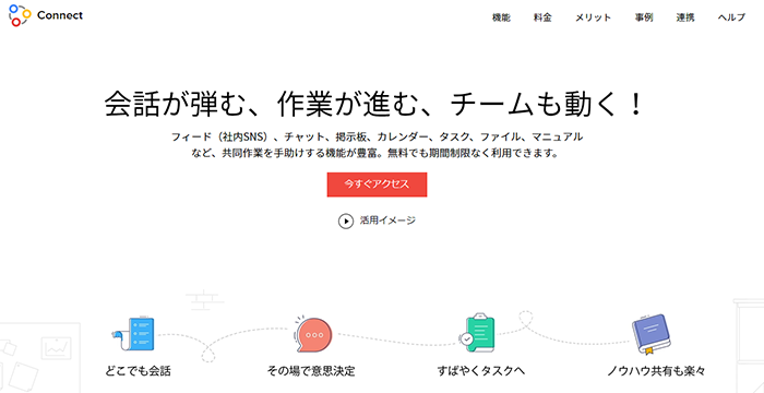 自分宛てのやり取りをメンション表示(グループチャットでも読んで欲しい個人を特定し通知する機能)し、かつそれを一覧表示してくれるのが特徴。情報のやり取りが増えても、重要な内容を見逃さずに済みます。また、小規模なビジネスであれば無料で十分に活用できるのが大きなメリットです。