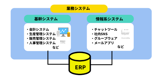 なお、業務システムには、会計管理システムや生産管理システム、販売管理システムなど、さまざまな種類があります。また役割や性質ごとに、「基幹システム」や「ERP」、「情報系システム」、その他周辺システムに分類することも可能です。