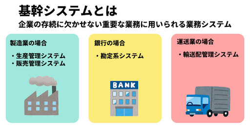 企業や業種ごとに基幹業務は異なるので、どのシステムが基幹システムになるかも、場合によってさまざまです。例えば、製造業の場合、生産管理システムや販売管理システムが基幹システムになります。銀行の場合は、会計勘定処理を行う勘定系システムが基幹システムです。