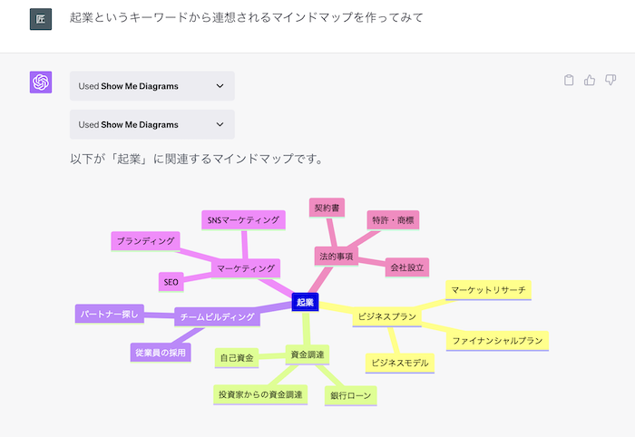 試しに「起業というキーワードから連想されるマインドマップを作ってみて」と命令してみた結果は以下の通りです。