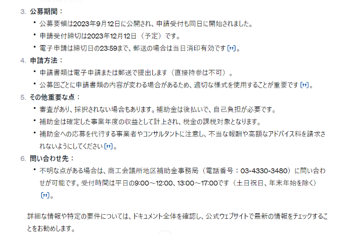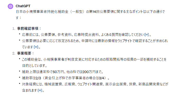 更に「補助対象者を詳しく教えてほしい」など、詳しく教えてもらいたい部分を入れれば、よりその内容を詳しく知ることができます。