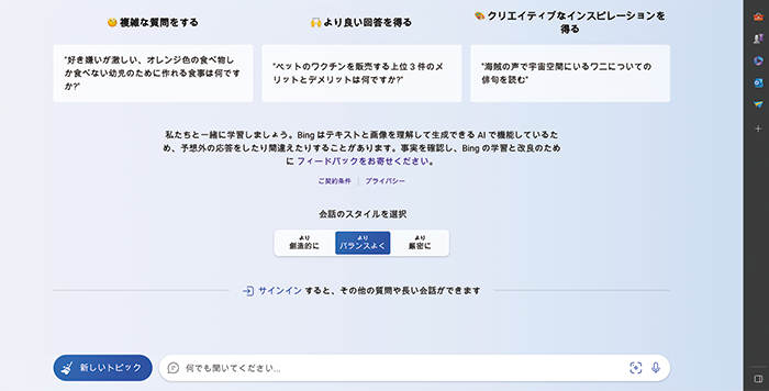 ログインが完了したらMicrosoftEdgeのトップページからチャット画面にアクセスすれば、すぐにBingAIが利用できます。