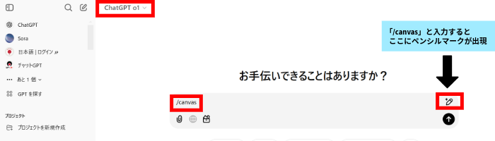 まずは画面左上に表示されている「ChatGPT 4o」もしくは「ChatGPT o1」をクリックします。次に、通常のチャットと同じようにプロンプトを入力するところに、「/canvas」とコマンドを打てば活用することが可能です。