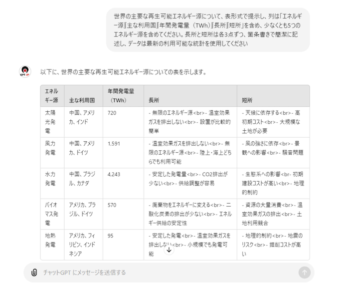 ◯:「世界の主要な再生可能エネルギー源について、表形式で提示し、列は「エネルギー源」「主な利用国」「年間発電量(TWh)」「長所」「短所」を含め、少なくとも5つのエネルギー源を含めてください。長所と短所は各3点ずつ、箇条書きで簡潔に記述し、データは最新の利用可能な統計を使用してください」