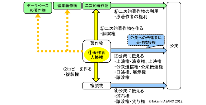 さらに、二次的著作物(いわゆる派生的著作物/改作著作物)を作り(図表1の⑤の場面)、二次的著作物を通じて原著作物が間接的に公衆に伝わること(図表1の⑥の場面)が考えられます。