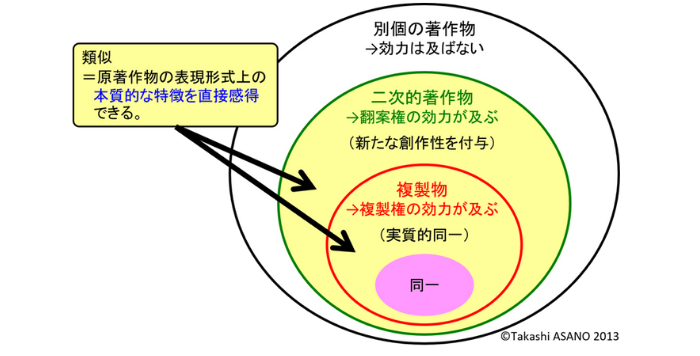 そこで、判例・学説では、①正当な権原または正当な理由がないのに(後述5.参照)、②他人の著作物に依拠して、これと同一または類似(表現形式上の本質的な特徴を直接感得できる:図表2)の著作物を、③利用した場合に、複製権または翻案権の侵害(著作財産権〔著作権〕侵害)となるとされています。