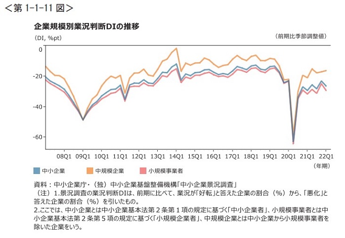 なお、「中小企業白書2022」では触れられていませんが、2019年第4四半期にも業況が落ち込んでいます。これは、2019年10月の消費税率引上げの影響と考えるのが妥当でしょう。