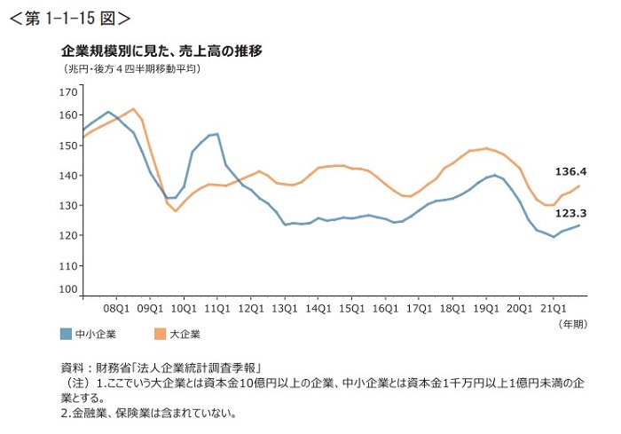 中小企業を規模ごとに分けたグラフに注目すると、どのようになっているでしょうか。中規模企業は感染症流行前を上回る水準まで回復していますが、小規模事業者は回復しきれていない状況にあることが分かります。