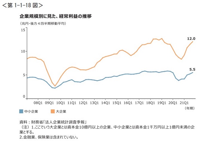 一方、第1-1-18図は経常利益を示すグラフです。中小企業の経常利益も、売上高と同様の傾向を示しています。リーマンショック後に大きく落ち込んだ後は緩やかに回復してきました。2020年に入ると感染症の影響を受けて減少しましたが、2020年第3四半期を底に中小企業の経常利益は再び緩やかに増加しています。