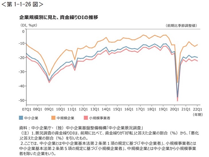 第1-1-26図のグラフは、資金繰りDI、つまり資金繰りについて「好転」と回答した割合から「悪化」と回答した割合を引いた数値です。中小企業の資金繰りDIは、リーマンショック後に大きく落ち込みました。その後は、東日本大震災や2014年4月の消費税率引上げに伴い一時的に落ち込みましたが、全体的に見ると改善していました。2020年第2四半期に大きく落ち込んだ原因は、感染症流行による売上げの急激な減少と、それに伴うキャッシュフローの悪化です。支援策が一定の効果を上げたことにより、翌第3四半期には大きく回復しています。ただし、2021年以降は回復のスピードが弱まっており、特に小規模事業者の資金繰りDIは感染症流行前の水準に戻っていないことから、今後も継続的な支援が必要とされていることが分かります。