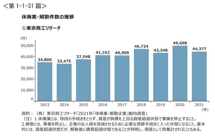 第1-1-31図の上段の(株)東京商工リサーチの調査によると、2021年の休廃業・解散件数は44,377件で前年比10.7%減でした。一方、下段の(株)帝国データバンクの調査によると、2021年の件数は54,709件で前年比2.5%減でした。