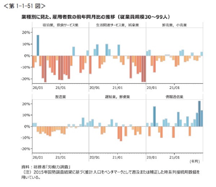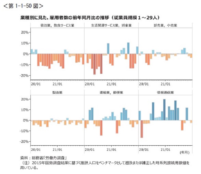 第1-1-50図が示す従業員規模が「1~29人」の区分では、「宿泊業、飲食サービス業」や「生活関連サービス業、娯楽業」という感染症で大きな影響を受けた業種について、前年同月比で雇用者数が減少している月が多いことがわかります。一方、「情報通信業」の雇用者数は、感染症が広がっている中でも前年同月を上回る月が多くなっています。