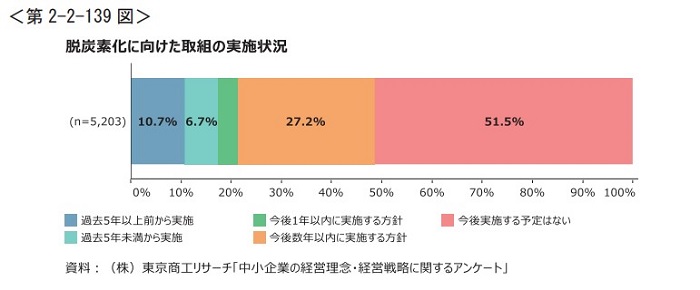 第2-2-139図によれば、何らかの取り組みを実施している企業の割合は17.4%であり、脱炭素化に向けた取り組みが十分に進んでいないことが明らかになりました。「今後実施する予定はない」と回答した企業が過半数となっています。