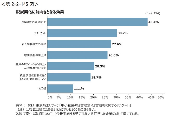 第2-2-145図のグラフによれば、最も多かった回答は「顧客からの評価向上」でした。自社の企業価値を高める効果を期待していることがわかります。また、「コストカット」という回答も多かったことから、光熱費や燃料費を節約できるなら取り組みたいと考えている企業が多いこともわかります。