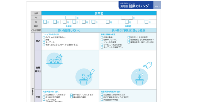 起業準備に関しては、創業カレンダーを使って、起業前後の基本手順を把握し、忘れていることがないかを確認しながら、進めていくことをおすすめします。こちらで作業の漏れがないか確認できますので、ぜひご活用ください!