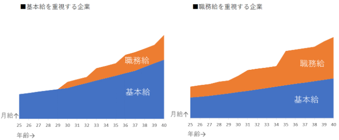重要度の高い役職に就く社員に高い職務給が与えられるものであるため、本来年齢は関係ないのですが、ある程度まで横並びで昇進させる仕組みを取ることで、職務給もほぼ勤続年数や年齢に比例するという企業が多く見られます。