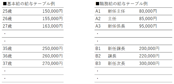 こちらはあくまで一例ですが、月給のベースを年齢による基本給と役職による職務給で定めているケースです。職務給のテーブルは「係長」「課長」など一般的な役職をもとに作成しても問題はないのですが、将来役職を新設したり、役職の中でも差異を作る余地を残す(以下のイメージでは新任とそれ以外のテーブルを分けている)ために、役職名とは異なる「等級」などで職務給テーブルを設計する場合が多くみられます。