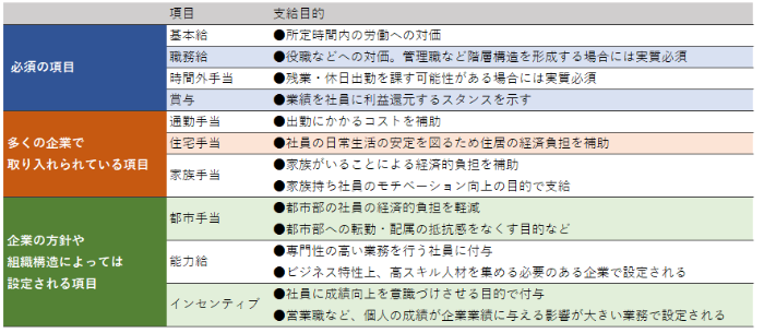「必須の項目」はほとんどの企業で欠くことはできないと思います。一方で、それ以外は企業のスタンスやビジネス状況に応じて取捨選択してよいですし、ここにはない手当などを整備することも可能です。