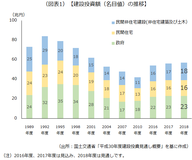 国土交通省によると、2018年度の建設投資額は57兆円の見通しとなっています。政府と民間の比率は約4:6と、公共事業の比率がいまだに高い業界です。政府事業としては土木、民間事業は住宅・事業用の建築案件が中心となります。