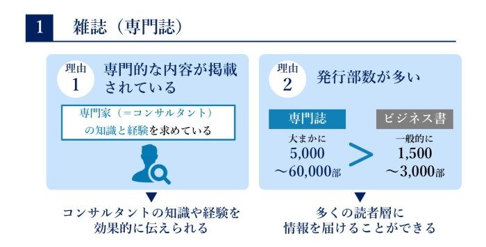専門誌とは、ある特定の業界やテーマに絞って情報を提供する雑誌です。例えば、経営者向け、人事・教育・会計などの職種向け、あるいは業界特化(医療、建設、製造など)したものがあります。これらは法人向けのビジネス誌として位置づけられるものもあり、まさに専門性を提供したいコンサルタントと親和性が高いのです。