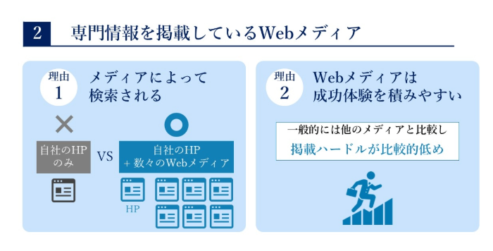紙媒体より掲載ハードルが低く、スピード感もあるWebメディアも、PRの初期段階では非常に有効です。特に「専門性の高い内容を掲載している」「実名・顔出しでの執筆が前提」のような、一定の質が担保されたメディアがおすすめです。