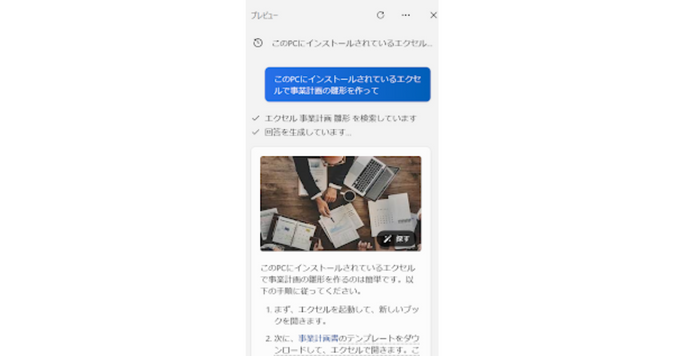 「事業計画を作って」と言うと、Microsoftのテンプレと使い方がが提案されました。