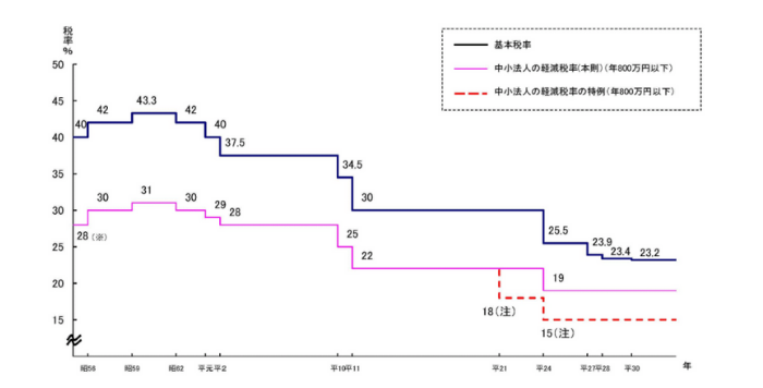 出典:財務省 法人税率の推移法人税率は年度ごとに見直されます。グローバル化や景気低迷の影響を受けてここ30年ほど減少傾向にあり、平成末期から令和にかけて過去最小の税率を維持しています。