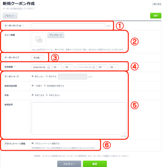 ⑤クーポン詳細:クーポンコードや使用回数、共有ボタンの設定