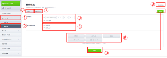 ⑦プレビューまたは保存:左のメニューバー「メッセージ」に保存され好きなときにおくることができる。