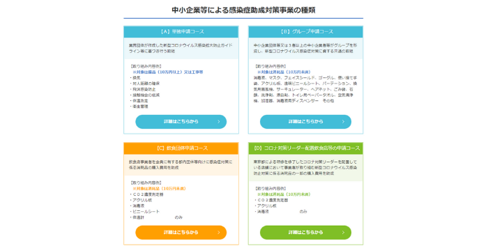 2021年12月まで申請を受け付けていた「中小企業等による感染症対策助成事業」では、【A】単独申請コース、【B】グループ申請コース、【Ⅽ】飲食団体申請コース、【Ⅾ】コロナ対策リーダー配置飲食店等の申請コースと4つの枠組みにわかれていました。