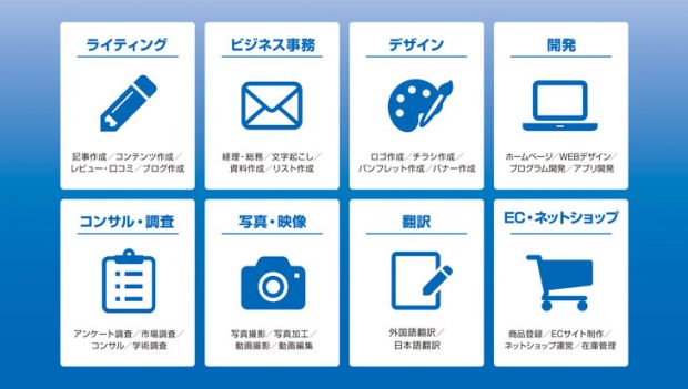 という3つの特徴を打ち出しています。外注カテゴリには、大きく分けて「ライティング」、「ビジネス事務」、「デザイン」、「開発」、「コンサル・調査」、「写真・映像」、「翻訳」、「EC・ネットショップ」という8種類の分類があります。具体的な 外注例としては、「飲食店のメニューやロゴマークをデザイナーに依頼する」、「突発的に発生する営業リストの作成やデータの入力などの事務業務を在宅ワーカーに依頼する」といったものがあります。