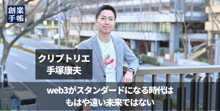 このWeb3を利用したビジネスを展開しているのがクリプトリエの手塚康夫さんです。2社目の創業となる同社を立ち上げる前のキャリアや、Web3を利用したビジネスの展望などについて、創業手帳代表の大久保が伺いました。
