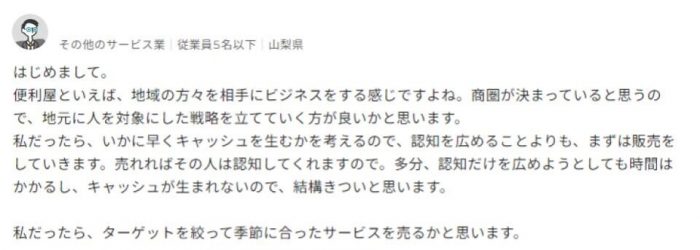本投稿に対しては、具体的な解決案が提示されています。便利屋=地域の人びとが主要な顧客となる、との想定したうえで商圏の人びとをターゲットとした戦略を立てることをおすすめしています。